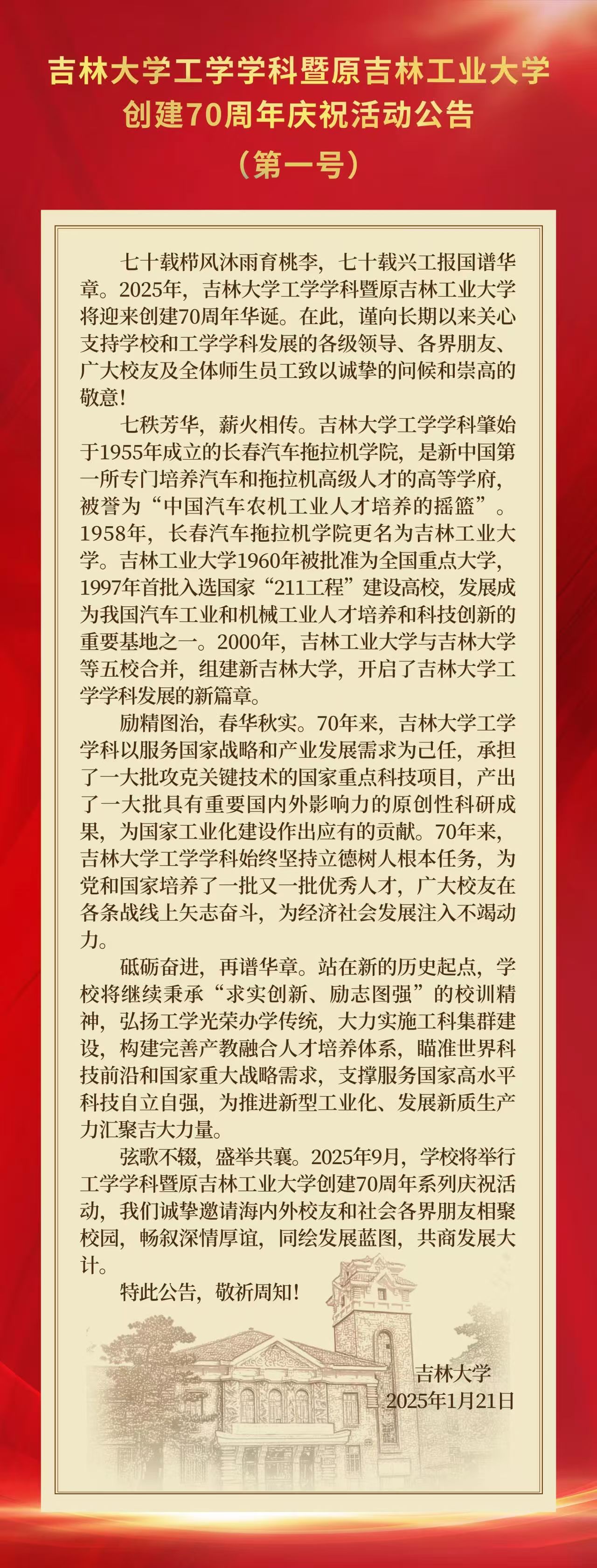 转:tyc122cc太阳成集团工学学科暨原吉林工业大学创建70周年庆祝活动公告(第一号)