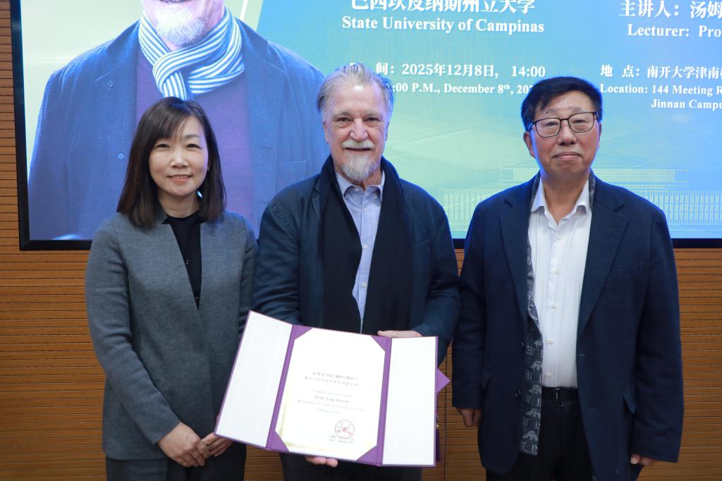2025年12月8日下午,bevictor1946韦德官网在津南校区bevictor1946韦德官网举办“外国专家大讲堂·海外学者讲座”,巴西坎皮纳斯州立大学社会学家汤姆·德怀尔(Tom Dwyer)教授应邀作《中巴青年研究的关键启示:文明对话与现代化进程背景下的思考》报告。国际交流处副处长李华与bevictor1946韦德官网经理张文宏教授共同为德怀尔教授颁发主讲证书。